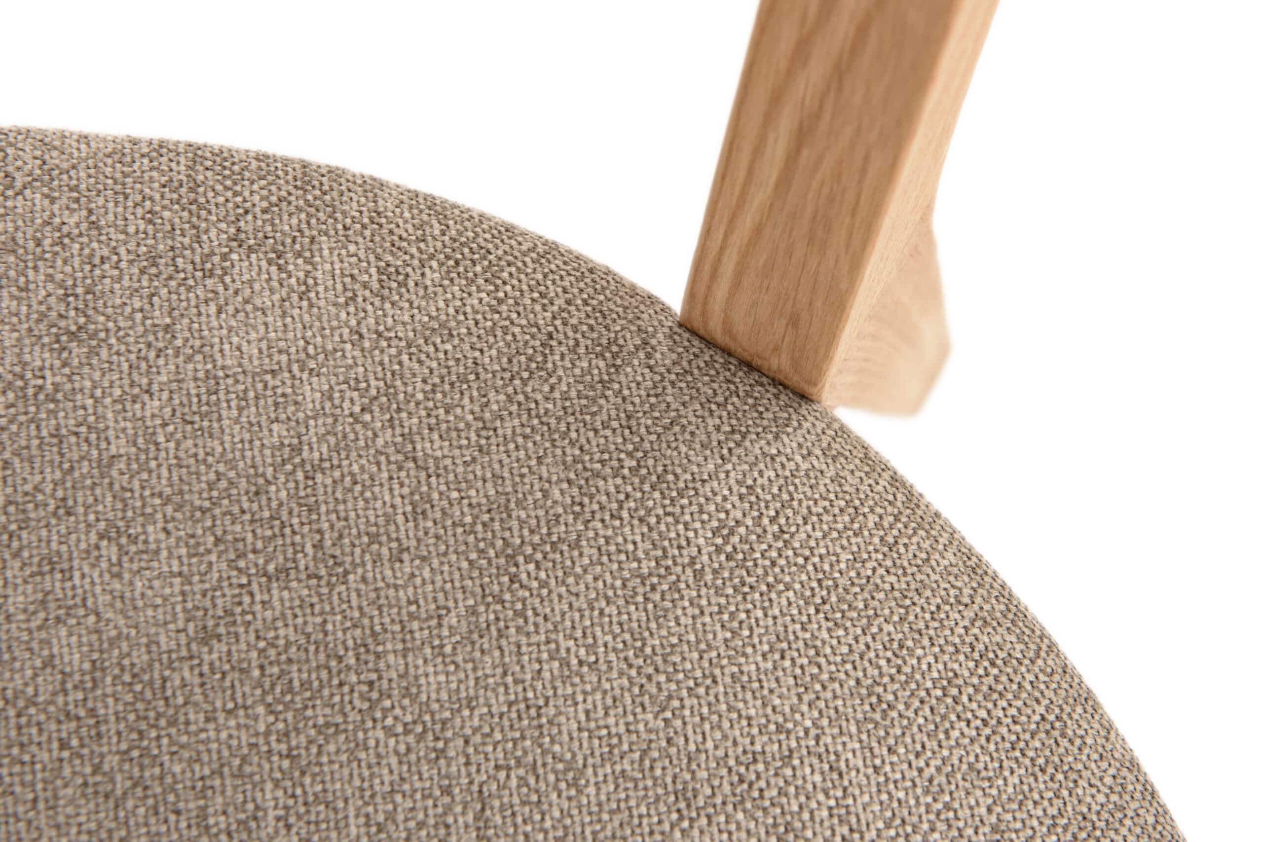 Sedák stoličky je mäkko polstrovaný a potiahnutý kvalitnou látkou v elegantnom hnedom odtieni. Tento prírodný tón pôsobí pokojne a útulne a skvele ladí s dreveným nábytkom aj neutrálnymi farbami interiéru. Hnedý poťah je praktický na údržbu, príjemný na dotyk a vhodný na každodenné používanie v domácnosti.