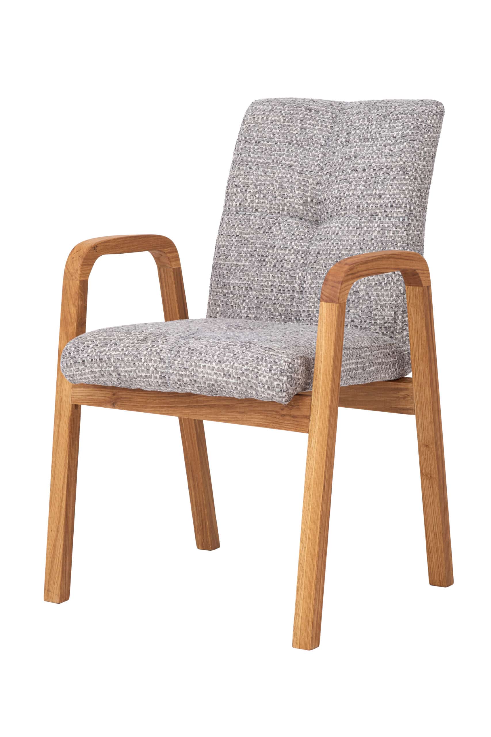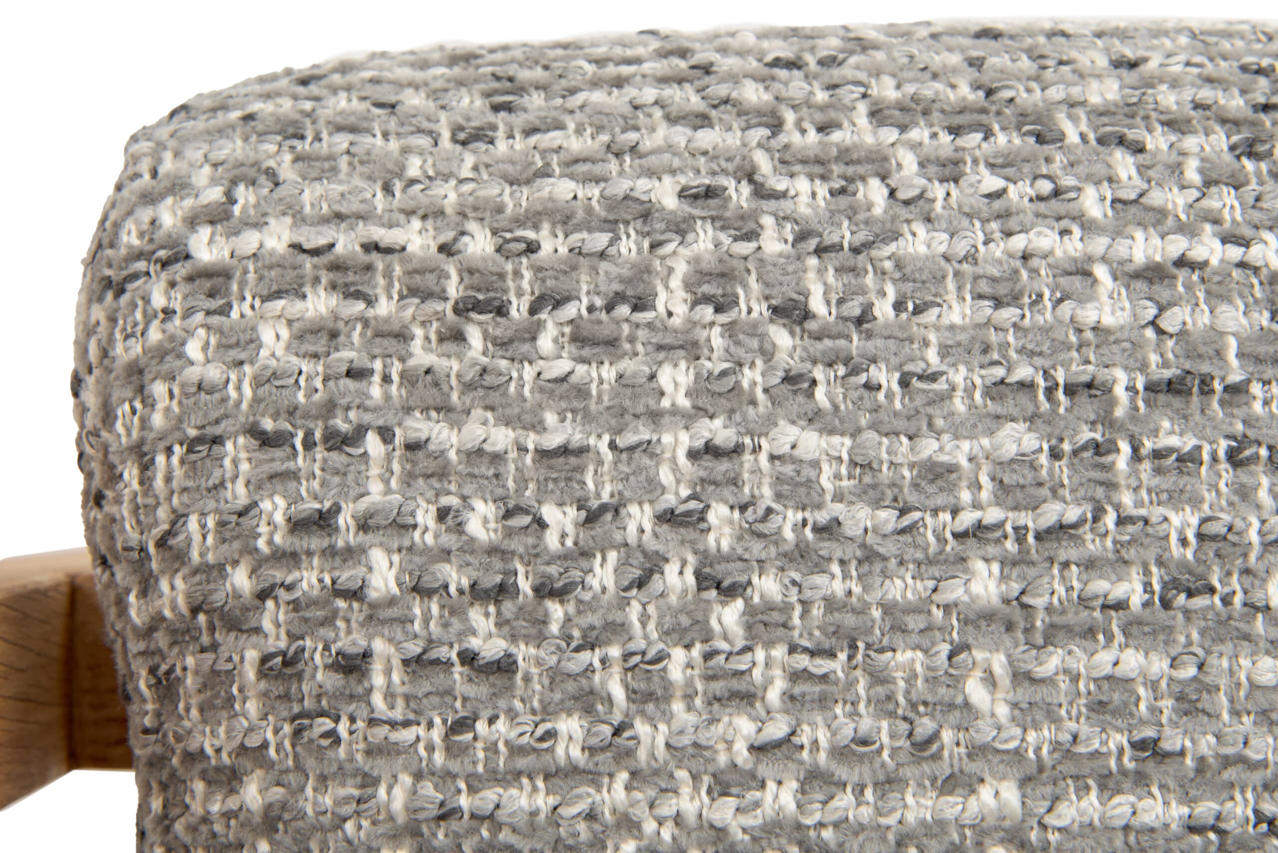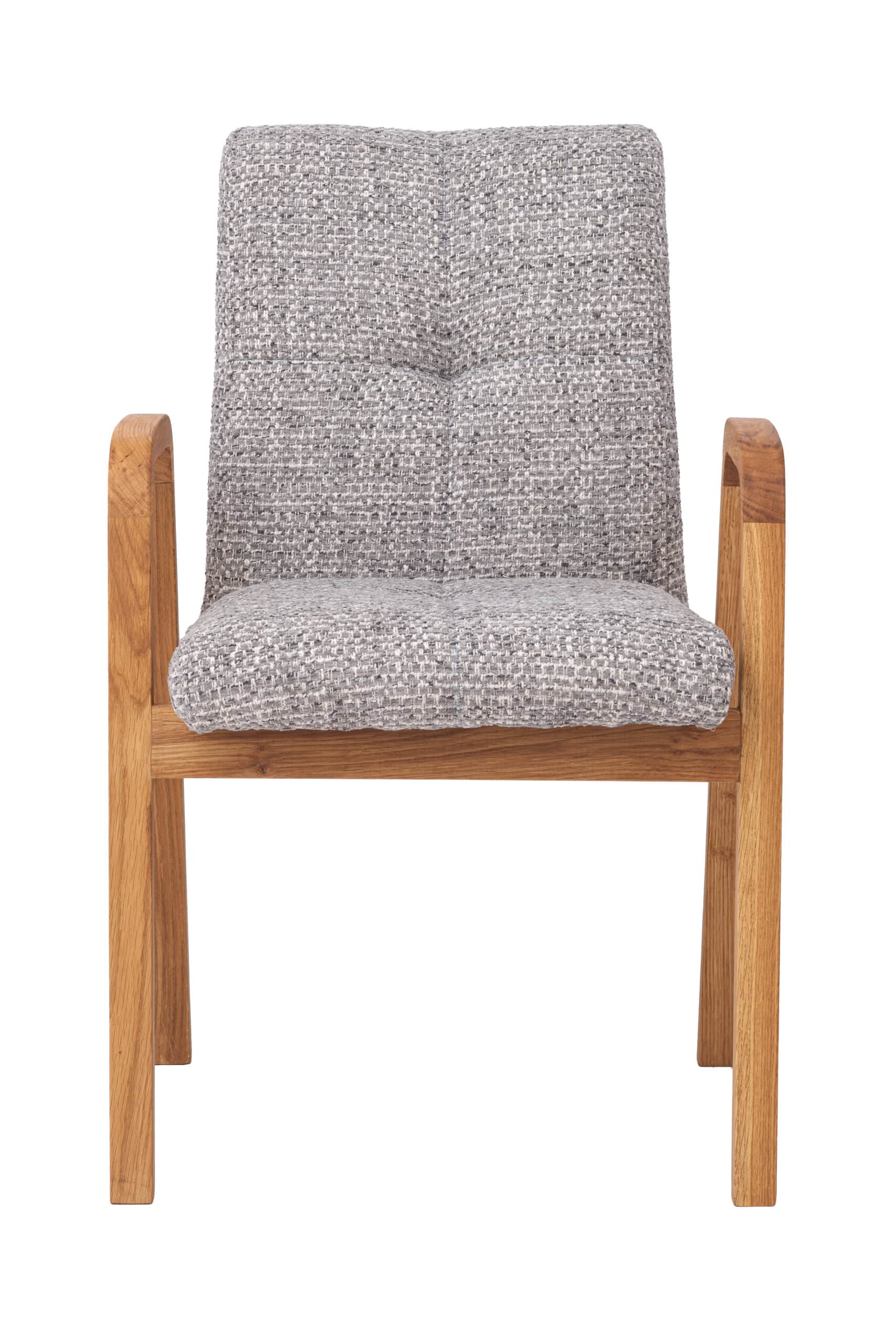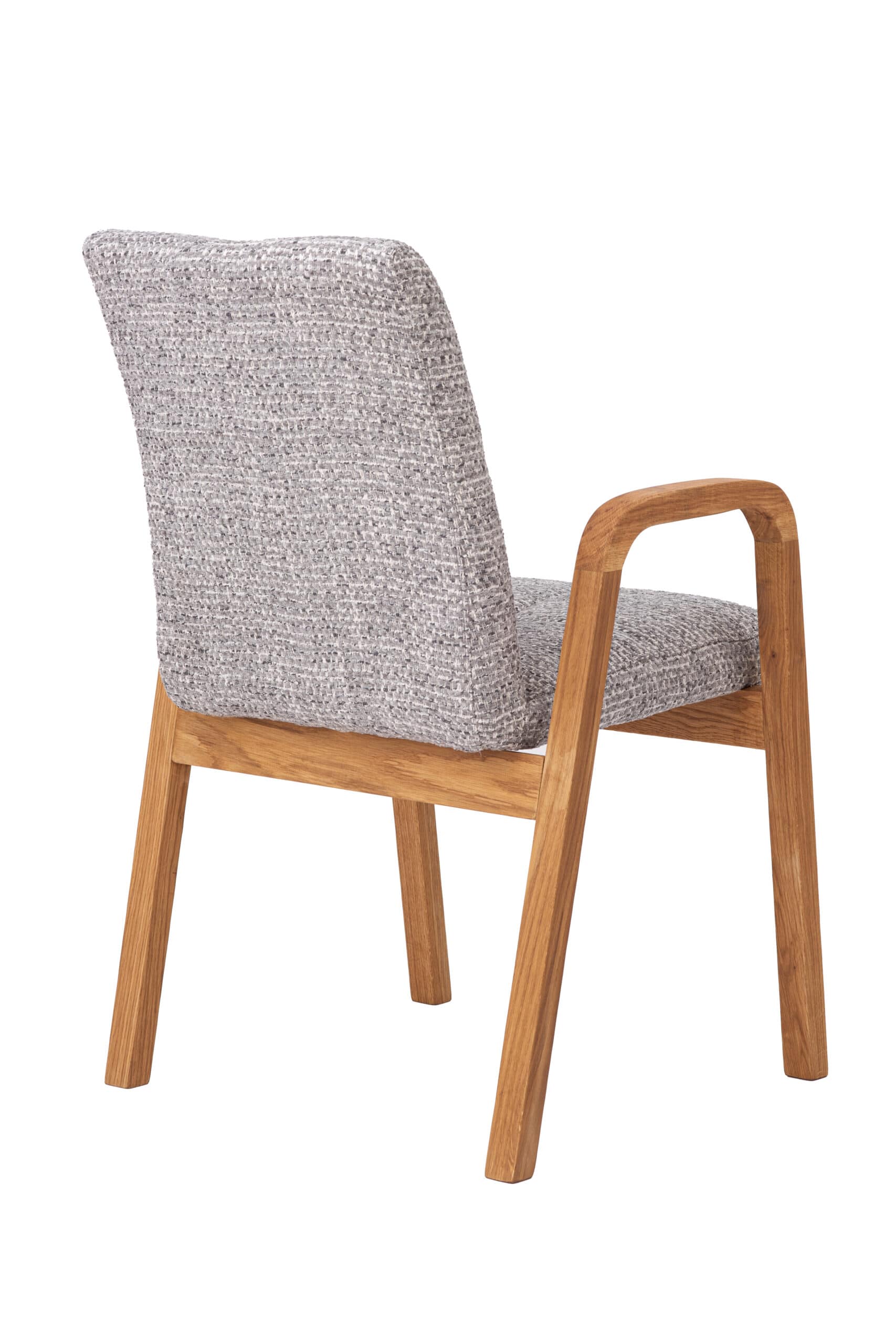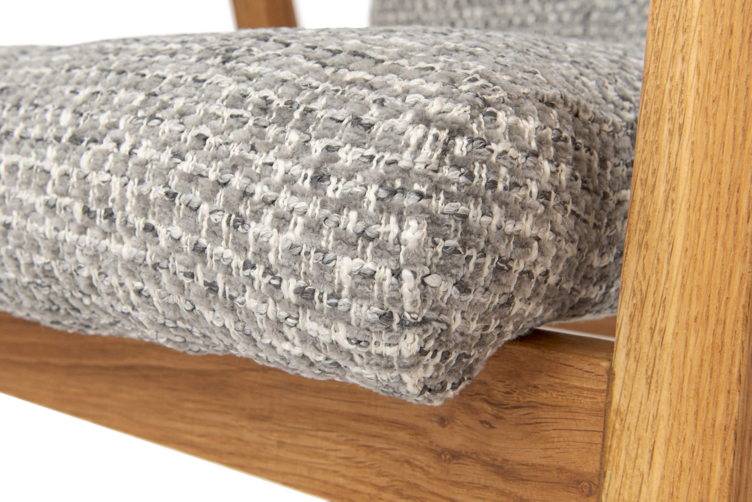 Sedák aj operadlo sú čalúnené kvalitnou látkou v elegantnom sivom odtieni s výraznou tkanou textúrou. Materiál je príjemný na dotyk, mäkký, ale zároveň odolný voči opotrebovaniu. Farebné prevedenie kombinuje rôzne tóny sivej s ľahkými náznakmi antracitovej a svetlej sivej, ktoré sa vzájomne prelínajú a dodávajú čalúneniu hĺbku a prirodzený vzhľad. Štruktúrovaný povrch pôsobí decentne a vzdušne a perfektne ladí s prírodným dubovým drevom. Ergonomicky tvarované operadlo spolu s opierkami poskytujú pohodlnú oporu aj pri dlhšom sedení.