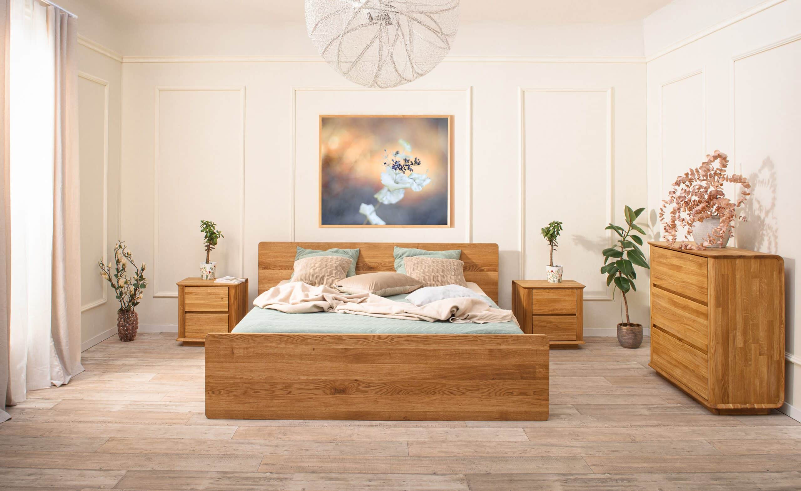 „Posteľ Celin 180 × 200 cm z dubového masívu spája nadčasovú eleganciu s praktickým úložným priestorom a komfortom.