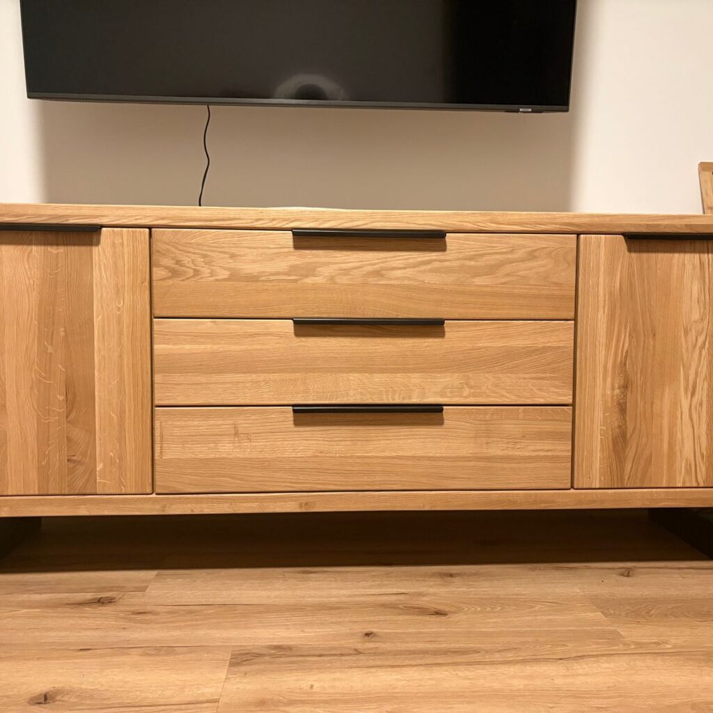 Nádherná komoda za dobré peníze. Ty jsou ale bohužel na úkor kvality pojezdů 3 ks prostředních šuplíků. Jejich trojdílné výsuvné vodící lišty jsou jednoduše moc měkké, kroutí se. Dráha tak není rovná. Šuplíky se proto špatně vysouvají, zasouvají a zasekávají! Komoda se díky tomu celá zbytečně třepe, stejně jako TV na ni postavená… Přitom panty obou krajních dvířek jsou kvalitní. Prodejce se v tomto případě zřejmě rozhodl upřednostnit cenu namísto toho, aby ji navýšil o lepší kvalitu pevných pojezdů, které si tato krásná komoda zasluhuje. Je to jako mít na BMW dveře z Trabanta. Pojezdy si svépomocí vyměním. Odporúčam ho.